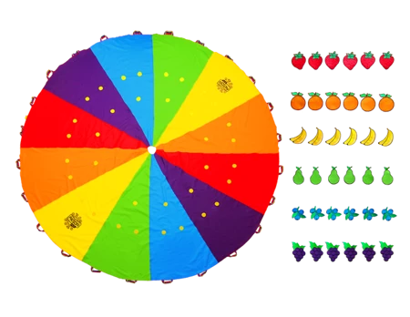- Chusta Edukacyjna AKSON tak jak klasyczna chusta animacyjna składa się z 12 kolorowych klinów, ale dodatkowo na każdym klinie znajdują się 3 rzepy w kształcie kół o średnicy 46mm. Do chusty dołączony jest zestaw 36 owoców z rzepami.
