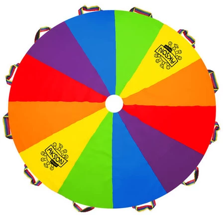 • Profesjonalna chusta animacyjna polskiej marki Akson. Tęczowa chusta animacyjna o średnicy 1,2 m posiada 12 uchwytów, odległość między uchwytami to 20 cm, wymiary w opakowaniu 15x20x9 cm, a waga produktu 400 g.