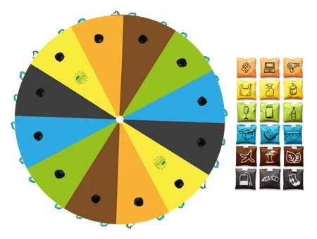 Składa się z 12 klinów, w kolorach odpowiadającym recyklingowi. Dodatkowo na każdym klinie znajduje się otwór z kieszenią o średnicy 10 cm.