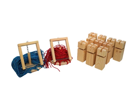 - Rozłóż klocki losowo na podłodze. Każdy gracz trzyma jeden lub dwa sznurki dźwigu. Sznurkami należy wspólnie unieść klocki tak, by powstała z nich wieża.