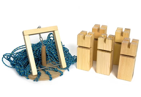 Materiał: Produkt wykonany z drzewa (sosna/świerk), sklejki, linki polipropylenowej, elementów metalowych.