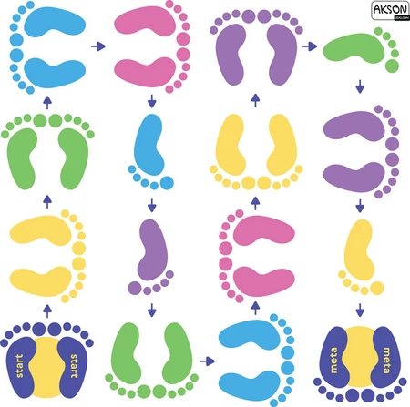 Celem gry jest odtworzenie skoków według układu stópek, który znajduje się na planszy. Sprawdźcie kto zrobi to najszybciej i bezbłędnie! Mając dwie maty możecie również organizować wyścigi grupowe.