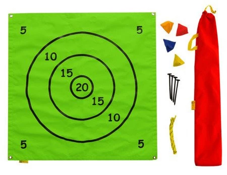 Gra Rzut do celu niezwykle popularna atrakcja w czasie zabaw i animacji dla grup w każdym wieku. Znakomicie wspomaga rozwój koordynacji wzrokowo - ruchowej, ćwiczy refleks i spostrzegawczość, równocześnie umożliwia czerpanie radości płynącej z ruchu i przebywania w grupie. Mata wykonana jest z wytrzymałego, wodoodpornego materiału łatwego do utrzymania w czystości, dzięki czemu gra nadaje się do korzystania na zewnątrz jak i w pomieszczeniach. Do gry dołączony jest sznurek oraz szpilki mocujące, co umożłiwia łatwe zamocowanie maty do podłoża w poziomie lub w pionie.