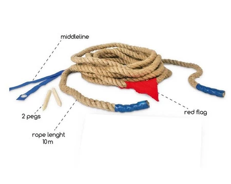 - Lina do przeciągania (długość: 10 m, średnica: 2 cm) wykonana z naturalnych konopii. Do zestawu dołączona jest linia start i meta wraz z kołeczkami do umocowania w miękkim podłożu. Zestaw zapakowany w poręczny worek.