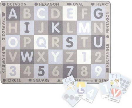 - Mata podłogowa o wymiarach 147 x 200 cm marki Melissa and Doug przedstawiająca litery, cyfry i kształty z angielskimi podpisami w zestawie z 36 kartami z zadaniami. Idealna do domu, zabaw animacyjnych oraz sali lekcyjnej na zajęcia j. angielskiego.