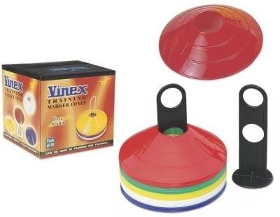 Pachołki o wysokości 5 cm i średnicy 19 cm, wykonane z tworzywa sztucznego, nie posiadające ostrych zakończeń. Komplet 40 sztuk wraz ze stojakiem.