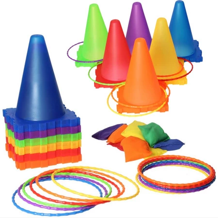 - - Rzuty obręczami na kolorowe stożki.