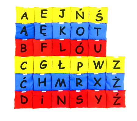 - Zestaw 33 woreczków gimnastycznych z polskim alfabetem w 3 różnych kolorach czerwonym, żółtym i niebieskim.