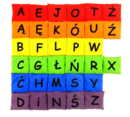 - Zestaw 33 woreczków gimnastycznych z polskim alfabetem w 6 różnych kolorach czerwonym, pomarańczowym, żółtym, zielonym, niebieskim i fioletowym.