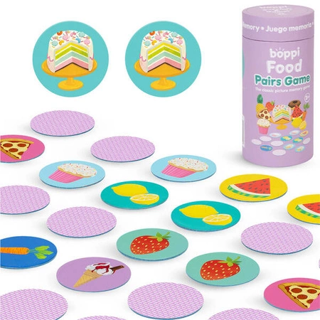 Boppi, układanka w pary memo Jedzenie to wspaniała, edukacyjna gra memory. Super sprawdzi się także w podróży. Gra ćwiczy koncentrację i pamięć oraz logiczne myślenie. Dzieci muszą starać się zapamiętać gdzie były odkładane karty z ilustracjami owoców, warzyw i różnych smakołyków, aby potem jak najszybciej znaleźć właściwą parę.