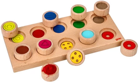 Cylindry dotykowe to wciągająca układanka, składająca się z planszy do gry przypominającej farbki, na której znajduje się 10 otworów wypełnionych różnymi kolorami i teksturami. W zestawie znajdują się również drewniane korki, które pasują do tych otworów i są wypełnione tymi samymi materiałami. Dzieci mają za zadanie dopasować korki do odpowiednich otworów, co angażuje ich zmysł dotyku. Młodsze dzieci mogą korzystać z gry, przyporządkowując walce według pasujących kolorów, podczas gdy starsze mogą wprowadzić dodatkowe wyzwania - jak zgadywanki z rówieśnikami czy zasłonięcie oczu!