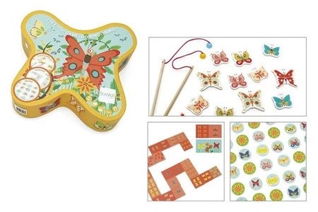 Dzięki grze dziecko poznaje liczby. Gra rozwija koordynację ruchowo-wzrokową, zręczność i cierpliwość. W zestawie znajduje się 12 drewnianych motylków (6x4x0.5cm) i dwie wędki wykonane z drewna, 28 sztuk dwustronnego domina (9.5x5cm) i 32 sztuki dwustronnego memo wykonane z tektury a wszystko zapakowane jest w śliczne kolorowe pudełko w kształcie motyla.