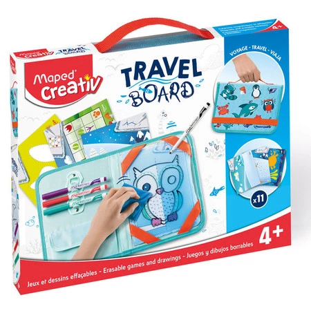 Rysuj i baw się gdziekolwiek jesteś! Tablica suchościeralna i transparentna Maped Creativ jest idealna do tworzenia rysunków w oparciu o dołączone szablony. Szablon podkładamy pod tablice i odrysowujemy obrazek za pomocą dołączonych markerów suchościeralnych. Bardziej doświadczeni artyści mogą tworzyć własne kompozycje.