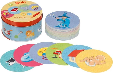 Karty do organizacji gry w pantomimę. Po wylosowaniu karty, gracz za pomocą min, bądź dźwięku ma przedstawić to co jest na niej narysowane. Gra pozwala wcielać się w wiele ról oraz uczy wyrażania emocji.
