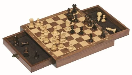 Drewniane szachy z magnetyczną podstawą i figurami, idealnie sprawdzą się także podczas podróży. Dwie szufladki do przechowywania figur.
