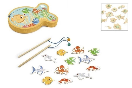 Dzięki grze dziecko poznaje liczby. Gra rozwija koordynację ruchowo-wzrokową, zręczność i cierpliwość. W zestawie znajduje się 12 rybek oraz dwie wędki. Produkt wykonany z drewna, zapakowany w śliczne kolorowe pudełko w kształcie rybki.