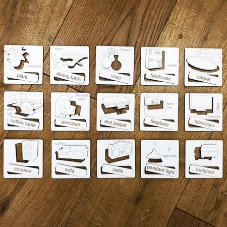 UKŁADANKA TEMATYCZNA – LIVING ROOM Produkt edukacyjny do nauki języka angielskiego.Wykonany z płyty HDF; grawerowany laserowo.Zawiera 45 elementów (15 tabliczek z wyciętymi kształtami, 15 kształtów, 15 nazw kształtów).Zastosowanie:– nauka słownictwa,– stymulacja rozwoju mózgu,– nauka logicznego myślenia,– ćwiczenie chwytności i precyzyjności ruchów,– ćwiczenie koncentracji i widzenia przestrzennego,– rozpoznawanie i dopasowywanie kształtów,– ćwiczenie pamięci,– rozwój myślenia przyczynowo-skutkowego,Potrzebujesz pomocy? Masz pytania?Zadaj pytanie a my odpowiemy niezwłocznie, najciekawsze pytania i odpowiedzi publikując dla innych.