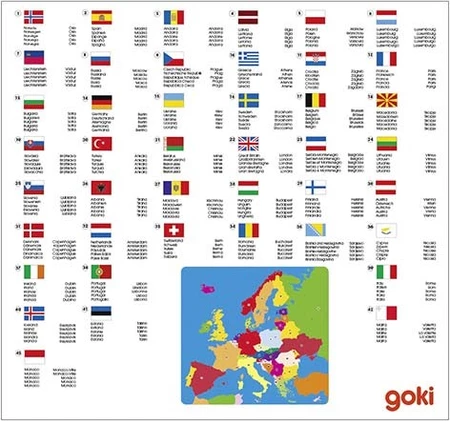 Dla maluchów ciekawych świata to rewelacyjna zabawka edukacyjna a przy okazji manualna. Na drewnianej podstawie są do ułożenia puzzle tak, aby utworzyły pełną mapę Europy. Do mapy dołączona jest osobna legenda, pomocna przy poznawaniu i układaniu poszczególnych państw. Produkt składa się z 35 drewnianych kształtów.