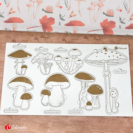Grzyby wraz z ich nazwami tworzą puzzle do włożenia na tablicę. Na tablicy znajdują się precyzyjnie wygrawerowane laserowo grzyby rosnące w polskich lasach wraz z ciekawostkami oraz owocem każdego z nich.