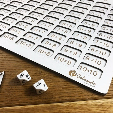 • Drewniana tabliczka mnożenia to gra dydaktyczna do nauki tabliczki mnożenia. Zawiera 103 elementy (tabliczkę mnożenia, 100 elementów z liczbami, dwie kostki z cyframi od 1 do 10).