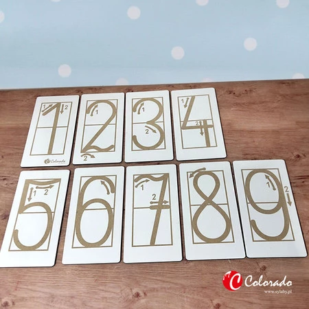 Zestaw cyferek przeznaczony jest do zabaw edukacyjnych dla dzieci. Dzięki wygrawerowanym cyfrom wraz z kierunkiem pisania dzieci uczą się prawidłowo pisać. Pisanie po śladzie pozwala dzieciom zapamiętywać kształt jak również jej prawidłowy zapis. Z tabliczek mogą korzystać rodzice w domu oraz nauczyciele w przedszkolu czy szkole. Produkt daje wiele ciekawych możliwości. Dziecko może wypełnić wygrawerowane cyfry różnymi elementami np. ziarenkami kawy, grochu, ciecierzycy itp.