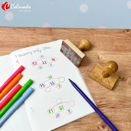 - Stempel z drewnianą rączką z wzorem grafu matematycznego z sześcioma okienkami do nauki i utrwalania działań: dodawania, odejmowania, mnożenia i dzielenia.