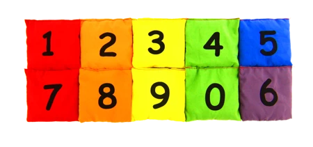 Zestaw "Woreczki gimnastyczne Cyferki ZESTAW 6 KOLORÓW" zawiera 10 woreczków z nadrukiem w 6 kolorach: