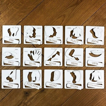 Drewniana układanka tematyczna - Części ciała zawiera 45 elementów (15 tabliczek z wyciętymi kształtami, 15 kształtów, 15 nazw kształtów).