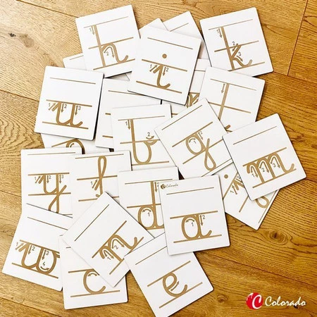 Prezentujemy drewniany alfabet do nauki pisania. Alfabet składa się z tabliczek drewnianych o wymiarach 16 cm na 14 cm. Na każdej tabliczce wygrawerowana jest litera w liniach (jak w zeszycie) wraz z prawidłowym kierunkiem jej pisania. Zestaw zawiera 24 tabliczki – a, b, c, d, e, f, g, h, i, j, k, l, ł, m, n, o, p, r, s, t, u, w, y, z.