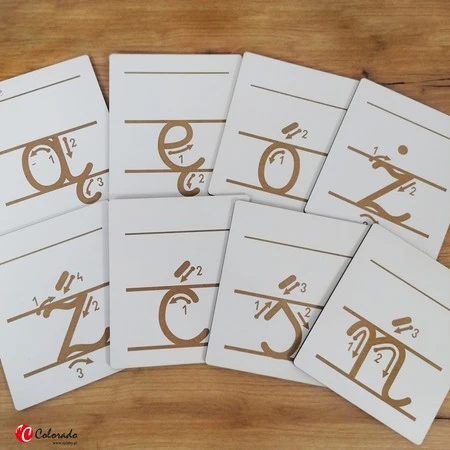 - Zestaw liter diakrytycznych do nauki pisania (małe litery) składa się z 8 tabliczek o wymiarach 16 x 14 cm.