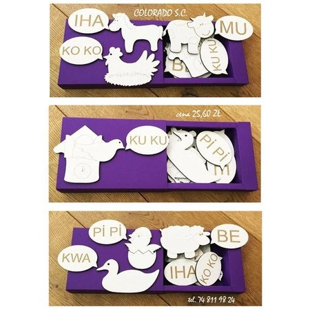 • Układanka dla dzieci, która polega na dopasowaniu obrazka do dźwięków, które wydaje przedstawione zwierzątko lub przedmiot. Pomaga w nauce pierwszych słów. Część pierwsza zawiera wyrażenia dźwiękonaśladowcze: PI PI, KWA, BE, KO KO, IHA, MU, KU KU.
