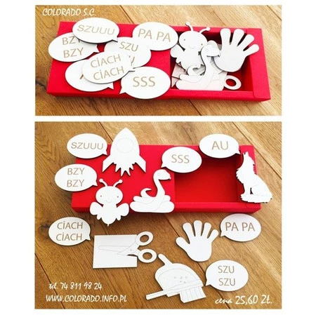 • Układanka dla dzieci, która polega na dopasowaniu obrazka do dźwięków, które wydaje przedstawione zwierzątko lub przedmiot. Część czwarta zawiera wyrażenia dźwiękonaśladowcze: SZUUU, BZY BZY, CIACH CIACH, SSS, AU, PA PA, SZU SZU.