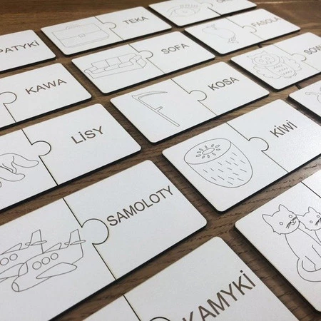 15 puzzli z dużymi, wyraźnymi obrazkami oraz 15 puzzli z nazwami do obrazków.
