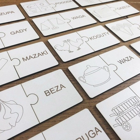 15 puzzli z dużymi, wyraźnymi obrazkami oraz 15 puzzli z nazwami do obrazków.
