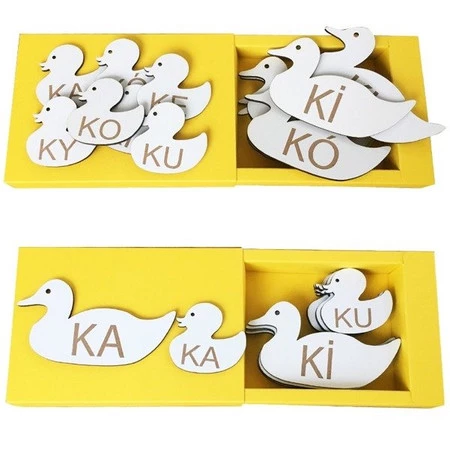 • Układanka do nauki czytania metodą krakowską. Układanka składa się z kaczek i małych kaczuszek, i polega na dopasowaniu takich samych 7 par sylab. Zestaw zawiera sylaby otwarte ze spółgłoską prymarną K.