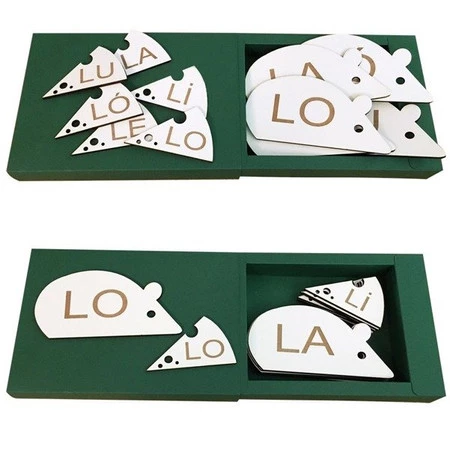 • Układanka do nauki czytania metodą krakowską. Układanka składa się z myszek i serków, i polega na dopasowaniu takich samych 7 par sylab. Zestaw zawiera sylaby otwarte ze spółgłoską prymarną L.