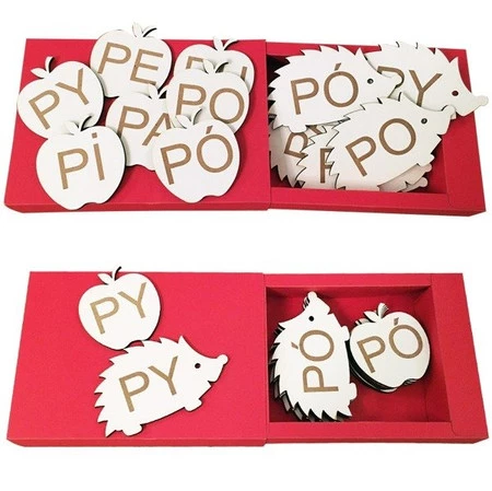 • Układanka do nauki czytania metodą krakowską. Układanka składaja się z jeży i jabłuszek, i polega na dopasowaniu takich samych 7 par sylab. Zestaw zawiera sylaby otwarte ze spółgłoską prymarną P.