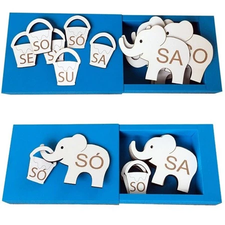 • Układanka do nauki czytania metodą krakowską. Układanka składa się ze słoników i wiaderek, i polega na dopasowaniu takich samych 7 par sylab. Zestaw zawiera sylaby otwarte ze spółgłoską prymarną S.