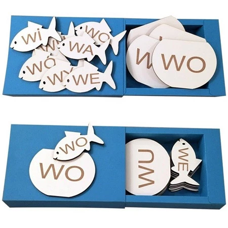 • Układanka do nauki czytania metodą krakowską. Układanka składa się z rybek i akwariów, i polega na dopasowaniu takich samych 7 par sylab. Zestaw zawiera sylaby otwarte ze spółgłoską prymarną W.