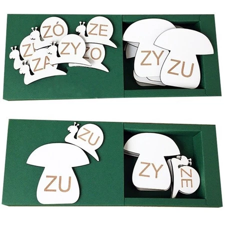 • Układanka do nauki czytania metodą krakowską. Układanka składa się z grzybków i ślimaków i polega na dopasowaniu takich samych 6 par sylab. Zestaw zawiera sylaby otwarte ze spółgłoską prymarną Z.