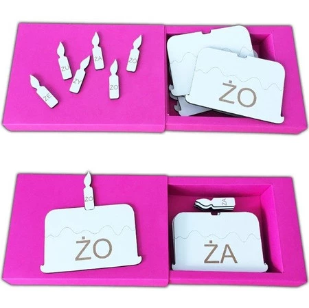 • Układanka do nauki czytania metodą krakowską. Układanka składa się z tortów i świeczek, i polega na dopasowaniu takich samych 6 par sylab. Zestaw zawiera sylaby otwarte ze spółgłoską sekundarną Ż.