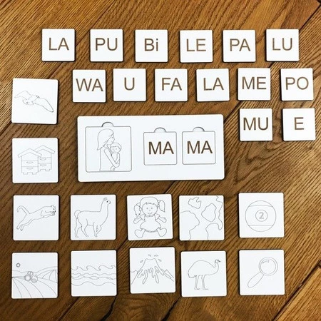 - Układanka sylabowa do nauki czytania metodą krakowską zawiera słowa: MAMA, LAMA, LALA, MAPA, LAWA, ULE, MEWA, POLE, PUMA, LUPA, BILA, EMU, FALE.
