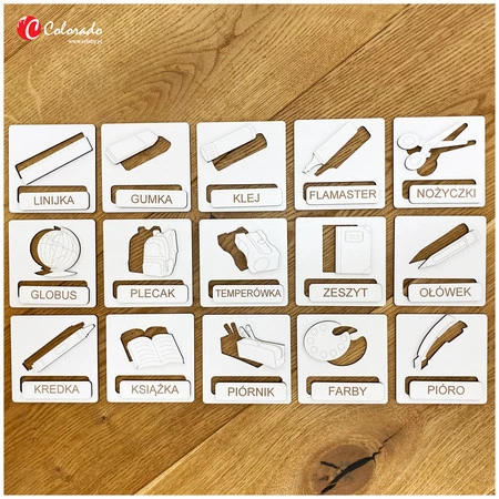 UKŁADANKA TEMATYCZNA – PRZYBORY SZKOLNE Produkt edukacyjny do nauki języka polskiego.Wykonany z płyty HDF; grawerowany laserowo.Zawiera 45 elementów (15 tabliczek z wyciętymi kształtami, 15 kształtów, 15 nazw kształtów).Zastosowanie:– nauka słownictwa,– stymulacja rozwoju mózgu,– nauka logicznego myślenia,– ćwiczenie chwytności i precyzyjności ruchów,– ćwiczenie koncentracji i widzenia przestrzennego,– rozpoznawanie i dopasowywanie kształtów,– ćwiczenie pamięci,– rozwój myślenia przyczynowo-skutkowego,Potrzebujesz pomocy? Masz pytania?Zadaj pytanie a my odpowiemy niezwłocznie, najciekawsze pytania i odpowiedzi publikując dla innych.