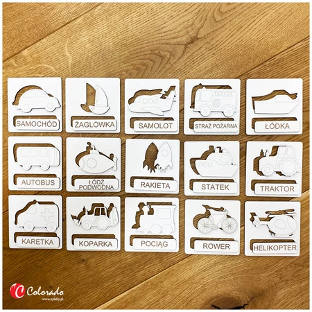 UKŁADANKA TEMATYCZNA – ŚRODKI TRANSPORTU Produkt edukacyjny do nauki języka polskiego.Wykonany z płyty HDF; grawerowany laserowo.Zawiera 45 elementów (15 tabliczek z wyciętymi kształtami, 15 kształtów, 15 nazw kształtów).Zastosowanie:– nauka słownictwa,– stymulacja rozwoju mózgu,– nauka logicznego myślenia,– ćwiczenie chwytności i precyzyjności ruchów,– ćwiczenie koncentracji i widzenia przestrzennego,– rozpoznawanie i dopasowywanie kształtów,– ćwiczenie pamięci,– rozwój myślenia przyczynowo-skutkowego,Potrzebujesz pomocy? Masz pytania?Zadaj pytanie a my odpowiemy niezwłocznie, najciekawsze pytania i odpowiedzi publikując dla innych.