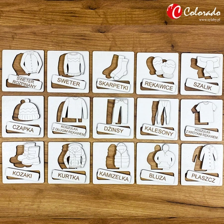 UKŁADANKA TEMATYCZNA – UBRANIA (CZEŚĆ 2) Produkt edukacyjny do nauki języka polskiego.Wykonany z płyty HDF; grawerowany laserowo.Zawiera 45 elementów (15 tabliczek z wyciętymi kształtami, 15 kształtów, 15 nazw kształtów).Zastosowanie:– nauka słownictwa,– stymulacja rozwoju mózgu,– nauka logicznego myślenia,– ćwiczenie chwytności i precyzyjności ruchów,– ćwiczenie koncentracji i widzenia przestrzennego,– rozpoznawanie i dopasowywanie kształtów,– ćwiczenie pamięci,– rozwój myślenia przyczynowo-skutkowego,Potrzebujesz pomocy? Masz pytania?Zadaj pytanie a my odpowiemy niezwłocznie, najciekawsze pytania i odpowiedzi publikując dla innych.