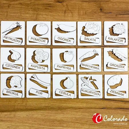 UKŁADANKA TEMATYCZNA – WARZYWA Produkt edukacyjny do nauki języka polskiego.Wykonany z płyty HDF; grawerowany laserowo.Zawiera 45 elementów (15 tabliczek z wyciętymi kształtami, 15 kształtów, 15 nazw kształtów).Zastosowanie:– nauka słownictwa,– stymulacja rozwoju mózgu,– nauka logicznego myślenia,– ćwiczenie chwytności i precyzyjności ruchów,– ćwiczenie koncentracji i widzenia przestrzennego,– rozpoznawanie i dopasowywanie kształtów,– ćwiczenie pamięci,– rozwój myślenia przyczynowo-skutkowego,Potrzebujesz pomocy? Masz pytania?Zadaj pytanie a my odpowiemy niezwłocznie, najciekawsze pytania i odpowiedzi publikując dla innych.