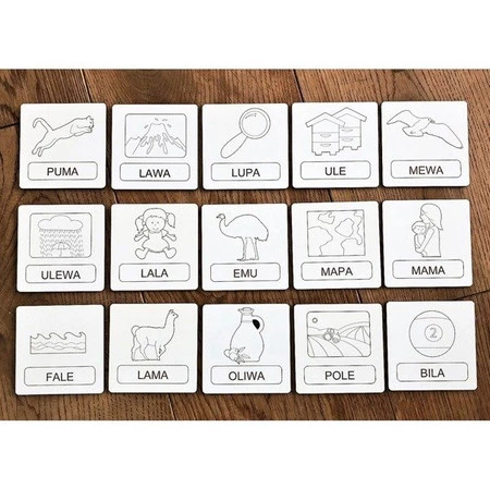 - Układanka wyrazowa do nauki czytania metoda sylabową. Część 1 zawiera słowa: MAMA, LAMA, LALA, MAPA, LAWA, OLIWA, ULE, MEWA, ULEWA, POLE, PUMA, LUPA, BILA, EMU i FALE. Słowa zostały dobrane pod kątem paradygmatów B, F, L, M, P oraz W.