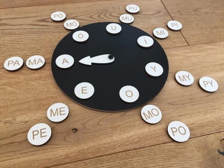 - Zegar sylabowyZegar sylabowy to pomoc edukacyjna i pomoc dydaktyczna przydatna w nauce czytania. W skład zestawu wchodzą 22 części, w tym: zegar, 7 samogłosek oraz 14 sylab. Wszystkie wykonano z płyty HDF o grubości 3mm. Zestaw został zapakowany w folię t