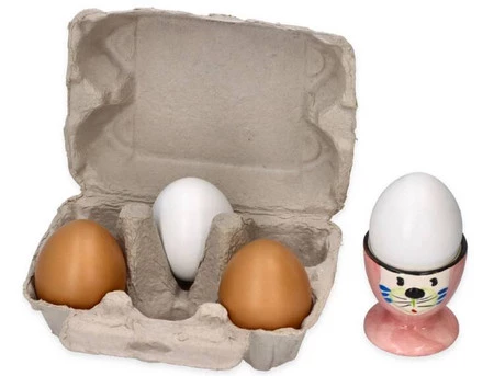 Zestaw zawiera 6 dużych drewnianych jaj zapakowanych w charakterystycznej wytłoczce. Trzy jajka są brązowe, a trzy białe.