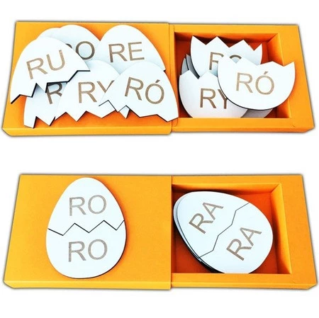 • Układanka do nauki czytania metodą krakowską. Układanka składa się ze skorupek jajek, i polega na dopasowaniu takich samych 7 par sylab. Zestaw zawiera sylaby otwarte ze spółgłoską sekundarną R.